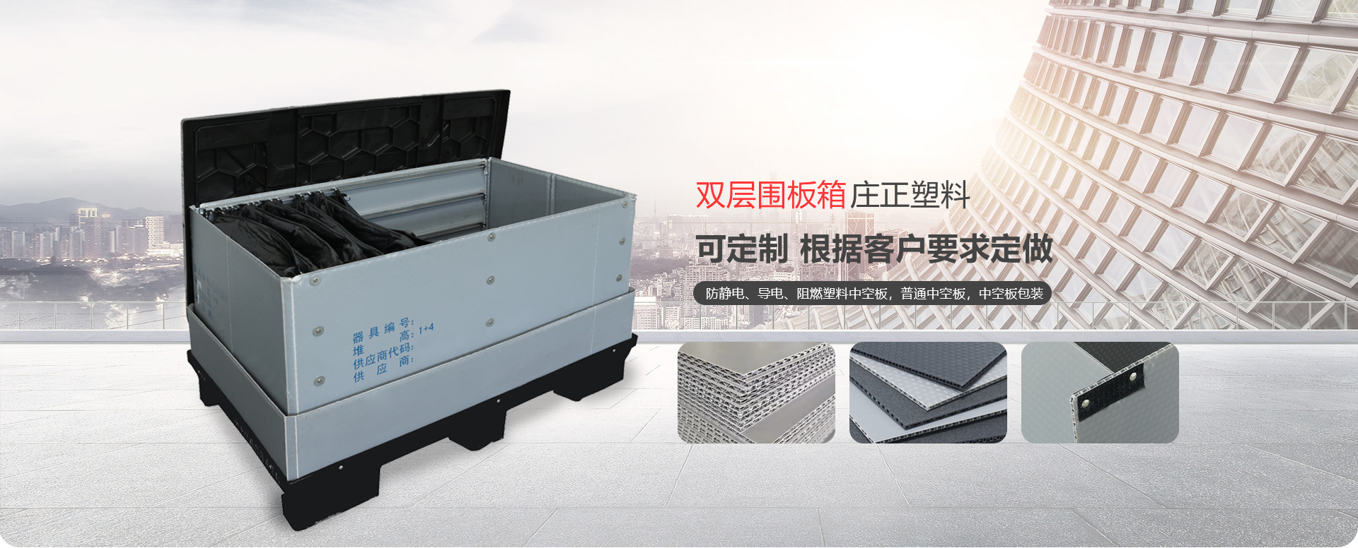 威海莊正塑料中空板有限公司是一家專注于圍板箱產(chǎn)品和中空板產(chǎn)品研究、開發(fā)、生產(chǎn)及銷售的高科技企業(yè)。我司專業(yè)生產(chǎn)銷售圍板箱、防靜電、導電、阻燃塑料中空板,普通中空板,中空板包裝等。是一家及研發(fā)、設計、生產(chǎn)、銷售一體化的專業(yè)制造商。產(chǎn)品具有質輕、防潮、耐油污、抗腐蝕、無毒、無污染顏色豐富的新型環(huán)保產(chǎn)品。 主要產(chǎn)品:圍板箱、普通塑料中空板,防靜電、導電塑料中空板,中空板周轉箱,中空板包裝箱,中空板墊板,中空板托盤、塑料包裝制品等系列產(chǎn)品。